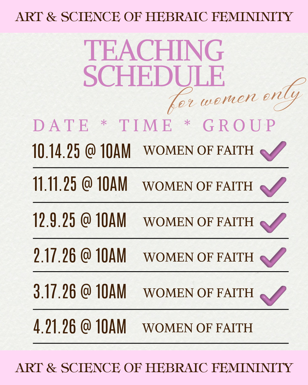 Feministry teaches via lectures, events, and lessons, to girls, teen, young women, women in middle age & beyond. We dive into the Hebraic Treasures hidden in the Word of God and how to apply them to your modern life. Book us today for your event!